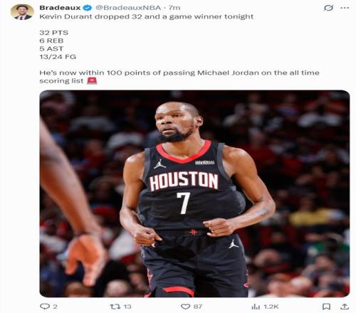 火箭官方晒KD神之一手!休媒称关键球有他太轻松:25次30+创历史
