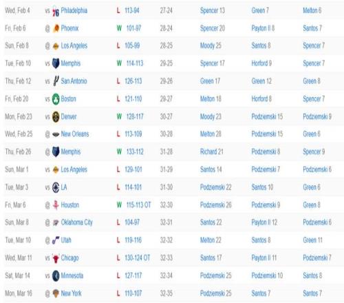 勇士队领先21分被逆转吞下五连败,终场前28秒波杰姆斯基拼下后场篮板,在终场前23秒错失了反超的三分球,终场前16秒桑托斯对沙梅特犯规,随后沙梅特两罚全中拉开到3分,终场前7秒波杰姆斯基抢了一个两分,但随后阿奴诺比两罚全中,终场前1秒桑托斯传球失误。