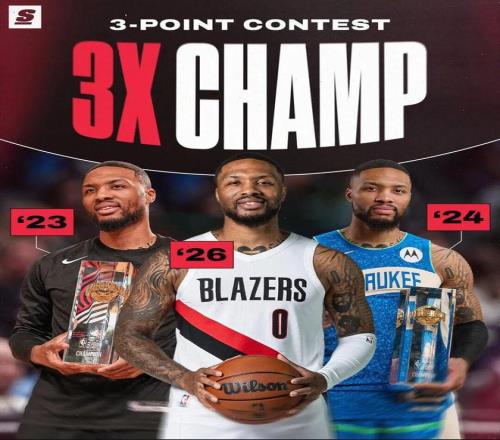 利拉德一把抓起冠军奖杯,这是他的第三座三分大赛奖杯(2023、2024、2026)。