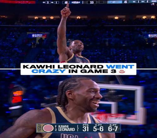 文班亚马继续强势带队,他单节独得19分2篮板。但这一节完全成为莱昂纳德的个人表演,他13投11中,三分7中6,一人狂砍31分!最后时刻还用一记三分球帮助条纹队锁定胜局。