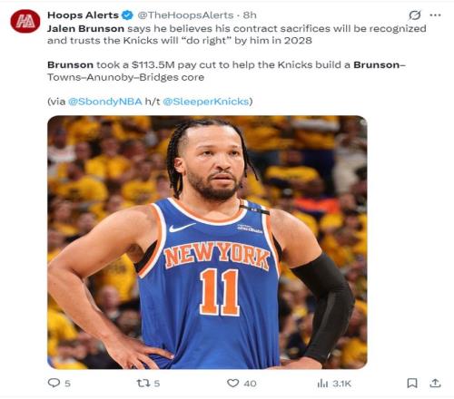 布伦森希望在2028年夏成为自由球员时公正的对待他下一份合同,因为他主动接受了大幅度降薪来帮助尼克斯组建布伦森、布里奇斯、阿奴诺比、唐斯的核心阵容。