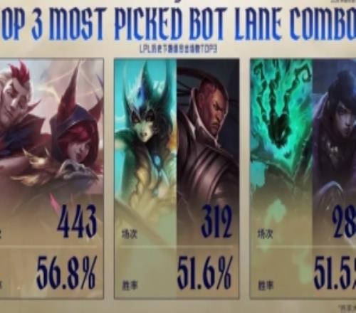 电竞体育2月26报道 今天官方直播流给出LPL历史下路组合登场数,霞洛是登场最多的组合,共有443场;