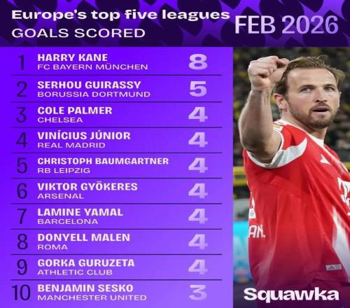 据Squawka统计,拜仁中锋哈里-凯恩在2月的德甲联赛中打入8球,高居五大联赛射手榜之首。多特前锋吉拉西打入5球,位居次席。