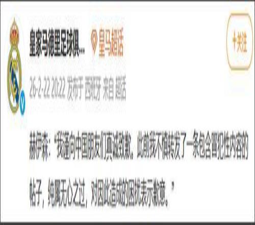 @皇家马德里足球俱乐部 2月22日在微博发布赫伊森的道歉内容,称“我谨向中国朋友们真诚致歉。此前我不慎转发了一条包含冒犯性内容的帖子,纯属无心之过,对因此造成的困扰表示歉意”。
