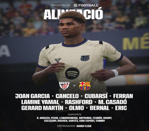 巴塞罗那首发:13-霍安-加西亚、24-埃里克-加西亚、5-库巴西、18-赫拉德-马丁、2-坎塞洛、17-卡萨多、22-马克-贝尔纳尔、10-亚马尔、14-拉什福德、20-奥尔莫、7-费兰-托雷斯