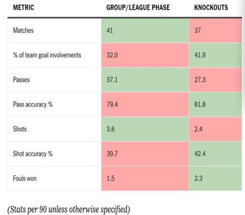 维尼修斯个人在淘汰赛阶段的传球和射门次数较少,但准确率略有提高,赢得更多犯规,并且他对皇马进球的贡献占比(球队62球中占26球)高于小组/联赛阶段(球队97球中占31球)。