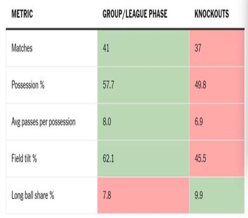 下表比较了在维尼修斯出战的欧冠比赛中,球队在小组/联赛阶段与淘汰赛阶段的数据。皇马在控球率、每次控球平均传球次数和场地倾斜度(进攻三区触球占比,反映场面上占优程度的指标)上均有下降,同时长传占比有所增加。