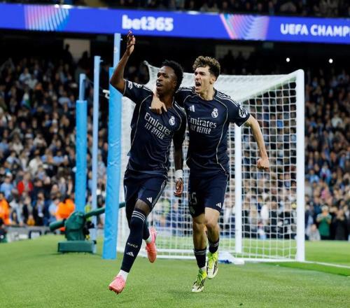 第68分钟,姆巴佩伤愈复出替补出场换下了迪亚斯;第73分钟,谢尔基弧顶处前沿也来了一脚远射,皮球是滑门而过;第77分钟,谢尔基禁区前沿挑传,努里门前高高跃起头槌破门,但还是处在明显越位位置进球无效。第81分钟,卡马文加往前传递,维尼修斯单刀推射被多纳鲁马挡出,巴尔韦德连补2脚入网,同样是因为越位无效。第93分钟,楚阿梅尼右侧传中,维尼修斯抢点垫射上演梅开二度的同时彻底终结比赛悬念;最终皇马2:1双杀曼城,两回合总比分5:1淘汰曼城拿到欧冠8强席位。