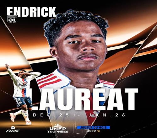 北京时间2月15日,官方消息,里昂前锋恩德里克当选法甲1月最佳球员。