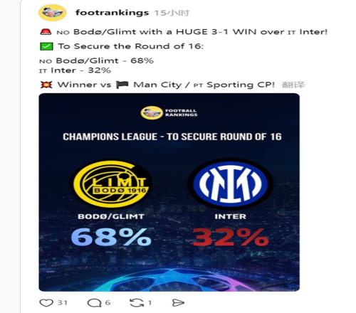 北京时间周四凌晨结束的一场欧冠淘汰赛附加赛首回合比赛,博德闪耀主场3-1击败国际米兰,迎来欧冠三连胜,并且成...