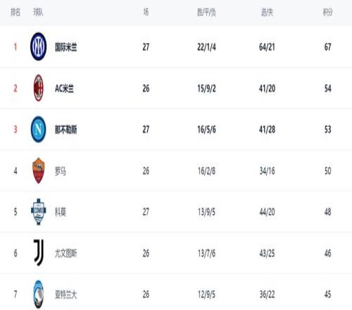 在积分榜上,国际米兰以绝对优势占据榜首位置。国际米兰22胜1平4负,拿到67分。而排名第2的AC米兰只拿到54分,足足落后国际米兰13分。这样的差距太惊人了。显然,国际米兰已经无限接近冠军了。那不勒斯赢球之后,总积分达到53分,排名第3。第4的是罗马,拿到50分。科莫赢球之后,总积分达到48分,超越了尤文图斯,升到第5名。而只拿到46分的尤文图斯掉到第6名。