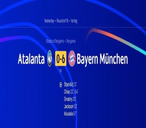北京时间3月11日,在欧冠1/8决赛首回合的比赛中,亚特兰大在开场67分钟过后就被拜仁慕尼黑打进6球,目前在主场0-6落后于对手。