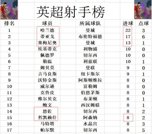射手榜方面,哈兰德22球继续领跑,蒂亚戈5球之差位列第2,塞梅尼奥13球排在第3。哲凯赖什今天未能进球,还是和沃特金斯,维尔贝克,恩佐,帕尔默等人8球刚好挤入前十。