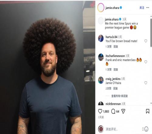 前热刺中场、评论员奥哈拉三天前曾在社交媒体上晒出图片,内容为自己变成爆炸头(蓄发哥梗),配文:“热刺下次赢得英超比赛时的我。”