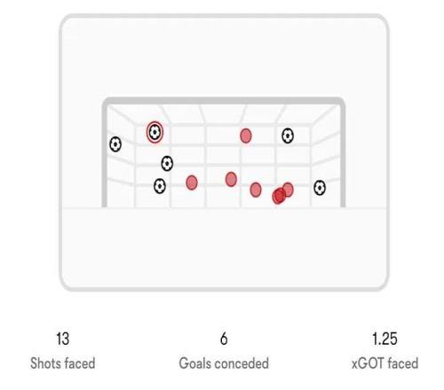 这并非偶然。本赛季英超,阿森纳门将总共面对13次禁区外的射门,其中6次转化成了进球。按照Opta的预期进球模型,根据射门角度、速度和门将位置,拉亚本应只丢1到2球,但他实际丢了6个。