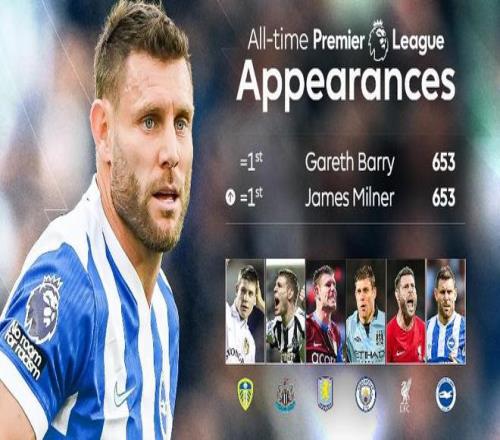 英超第26轮,布莱顿客场对阵维拉,上半场40岁的米尔纳替补登场,迎来英超生涯第653次出场,追平英超历史出场纪录。