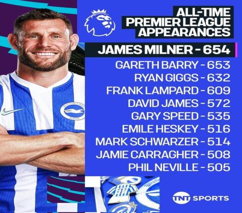 英超第27轮,布莱顿客场对阵布伦特福德,40岁的老将米尔纳首发出场,他也以654次出场超越加雷斯-巴里,正式创造英超历史出场纪录!