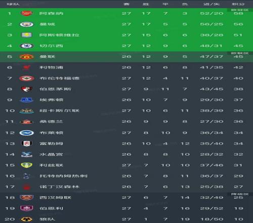 英超最新积分榜