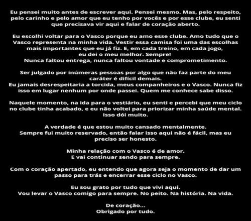 “在深思熟虑之后,我决定坦诚地表达我的感受。”库蒂尼奥写道,“我选择回到瓦斯科达伽马是因为我对俱乐部的热爱。我热爱这里的一切,甚至超过了我过去的一切。在每一次训练和每一场比赛中,我都全力以赴。我从未缺乏奉献精神、意愿和责任感。”