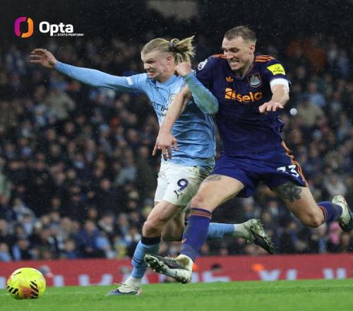 据统计,本场比赛哈兰德赢下12次对抗,这是他个人在五大联赛191场(德甲67场+英超124场)中的单场最高数据。