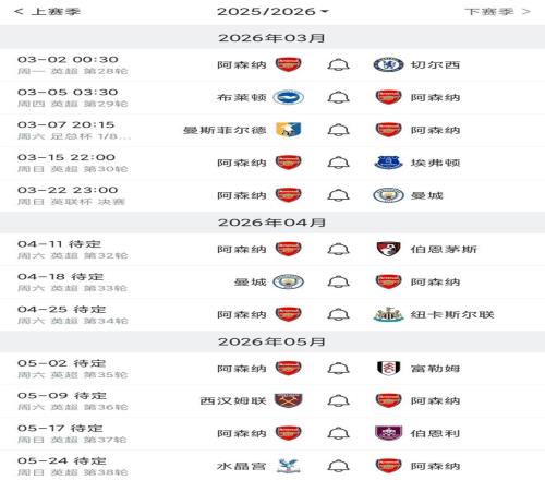 阿森纳剩余英超赛程