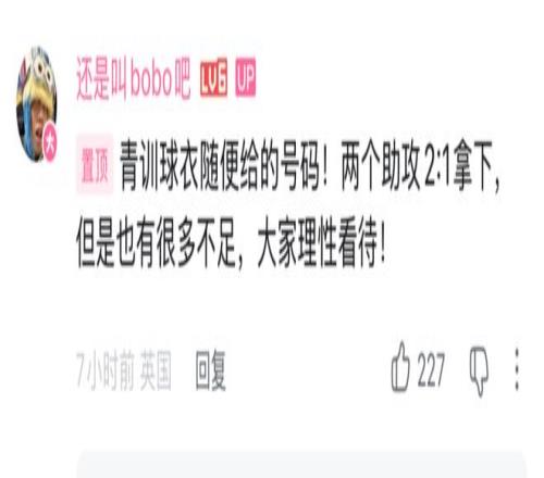 根据博主“还是叫bobo吧”的透露,徐彬本场身披10号球衣登场。需要说明的是,青训梯队球衣号码并无固定分配,10号为随机发放。