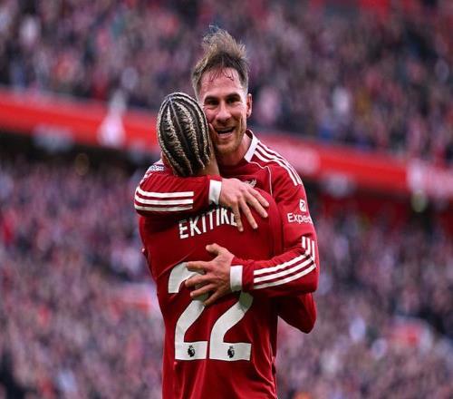 第43分钟,利物浦右侧角球,萨拉赫罚向禁区,埃基蒂克接范戴克头球摆渡,麦卡利斯特直接凌空抽射破门,利物浦3-0西汉姆联。