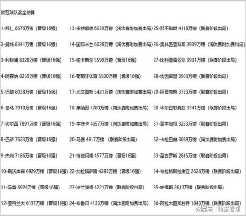 欧冠16强全部确定后,根据专业数据机构的统计,拜仁慕尼黑获得的奖金最高,超过8500万英镑,折合超过一亿美元。晋级16强的球队当中,博德闪耀和加拉塔萨雷最低,只比拜仁的一半稍多一些,比出局的多特蒙德和国际米兰还要少。至于联赛阶段排在垫底,首次参加欧冠的阿拉木图凯拉特,只有拜仁的两成。