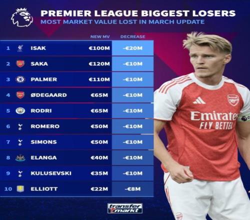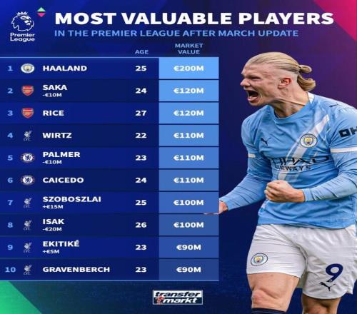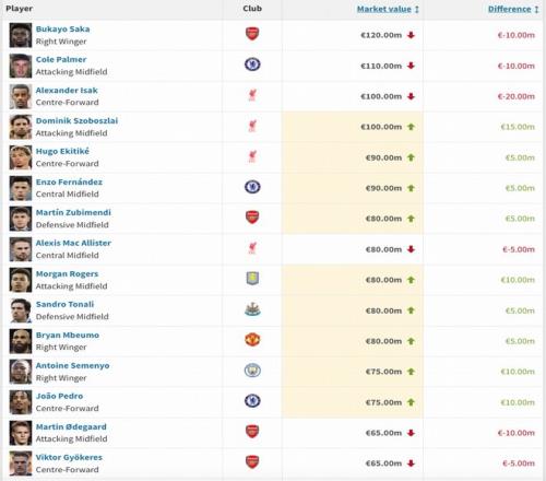 3月9日,英超球员身价更新,萨卡降至1.2亿欧,帕尔默降至1亿欧,索博涨至1亿欧,伊萨克下跌2000万欧,身价来到1亿欧。
