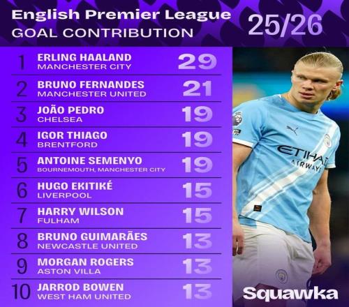 周一,知名数据机构Squawka盘点了本赛季英超直接参与进球数据,曼城中锋哈兰德排在榜首,这位挪威射手本赛季已有22球7助攻入账。
