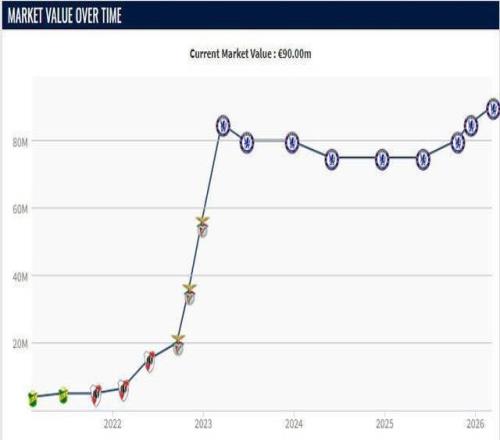 在2023年冬窗以1.2亿欧元的转会费加盟切尔西后,恩佐的身价从5500万欧大涨至8500万欧,不过由于当赛季切尔西表现不佳加上他自己的适应问题,23年6月,他的身价下跌至8000万欧。