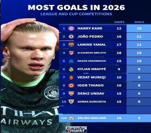 北京时间3月12日,曼城在欧冠1/8决赛首回合的比赛中客场0-3不敌皇马,此战哈兰德首发出场但表现令人失望。赛后来自德转的统计指出,哈兰德2026年在各项赛事里代表曼城出场16次仅仅打进4球,同期哈里-凯恩以12场15球的数据高居全欧第一。