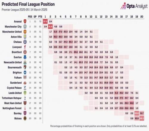 据OPTA利用超级计算机进行的10000次模拟,阿森纳夺得英超冠军的概率为97.6%,曼城夺冠概率为2.4%。至于其他英超18队,夺冠概率均为0%。