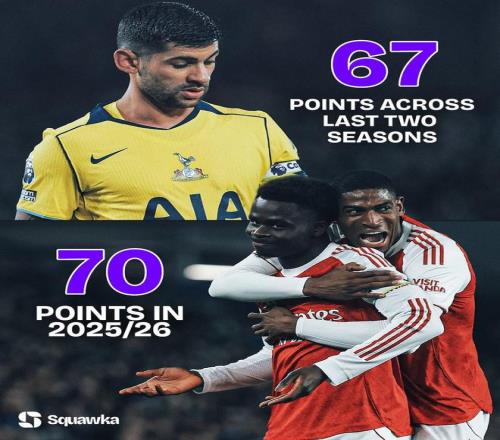 赛后来自Squawka的统计指出,阿森纳本赛季英超31轮21胜7平3负拿到70分的成绩已经超过了同城死敌热刺近两个赛季的英超积分总和。