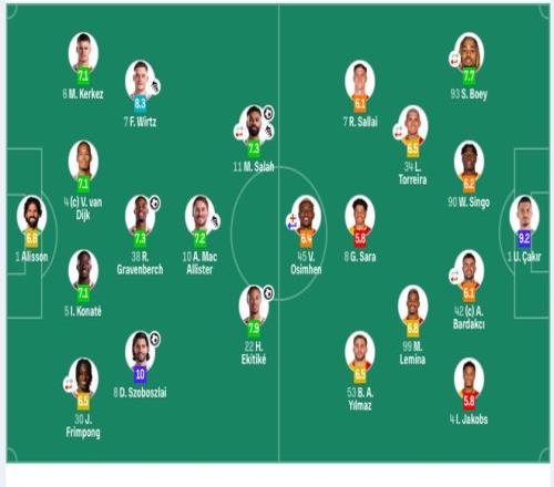 加拉塔萨雷首发:1-恰基尔、90-辛格、42-巴尔达克彻、4-伊斯梅尔·雅各布斯、93-博伊(46’77-诺阿·朗)(80’9-伊卡尔迪)、34-托雷拉(60’11-阿克金)、99-勒米纳、8-加布里埃尔·萨拉、53-伊尔马兹、7-绍洛伊、45-奥斯梅恩(46’10-萨内)