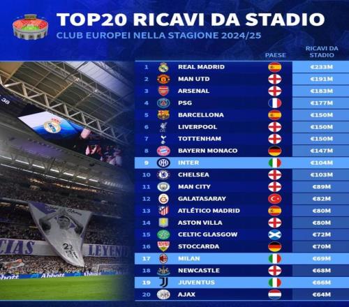 德转统计2024-25赛季欧洲俱乐部球场门票收入TOP20:
