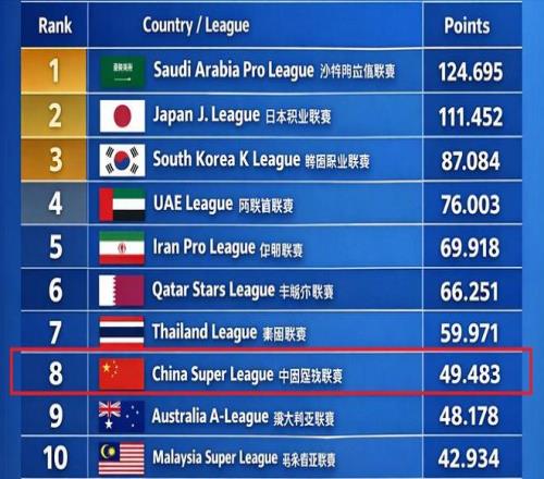 而更尴尬的是身后的澳超联赛,也已经逼近中超。目前仅仅比中超联赛少1.3分。要知道,本赛季的亚冠精英赛仅仅是联赛阶段结束了,接下来还有淘汰赛,而代表澳超的墨尔本城有望继续自己高光的表现。