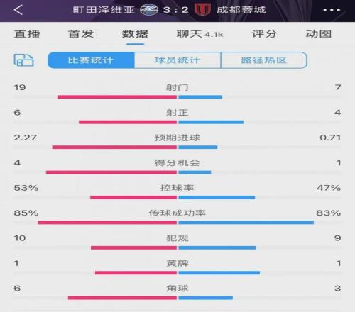 赛后数据统计显示,蓉城全场射门7-19,射正4-6,控球率仅47%,得分机会1-4。每一项关键数据都在被对手碾压。要知道,町田此役轮换了包括主力门将在内的9名球员,基本算是一支“二队”甚至“三队”阵容。