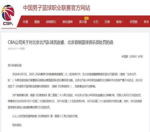 CBA重磅罚单来了,对于北京首钢队球员赵睿的不当言行,CBA官方开出了本赛季至今最严厉的罚单,赵睿将会被禁赛3场...