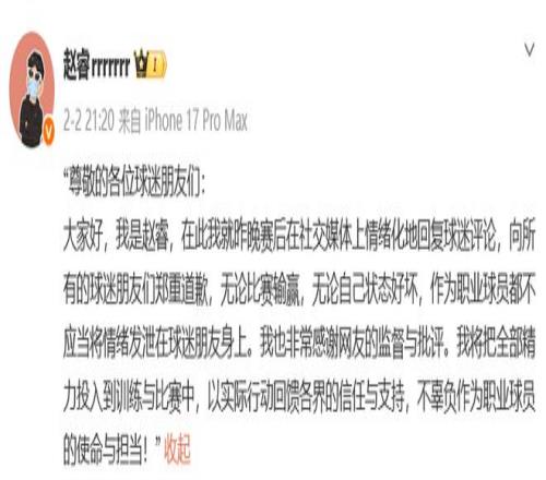 他表示,无论比赛输赢,无论状态好坏,作为职业球员都不应当将情绪发泄在球迷朋友身上。非常感谢网友的监督与批评,我将把全部精力投入到训练与比赛中,以实际行动回馈各界的信任与支持,不辜负作为职业球员的使命与担当。