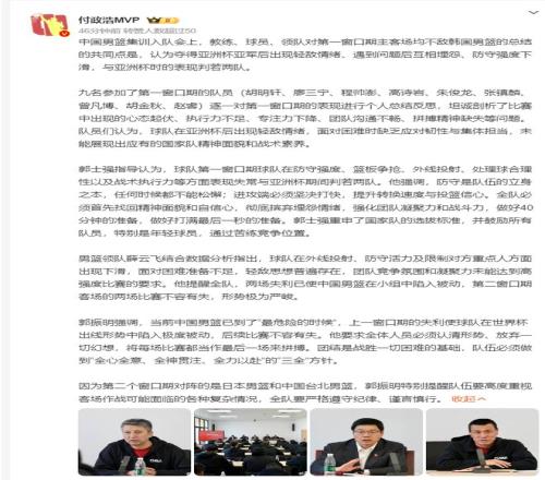 中国男篮的集训入队会上,郭振明表示‘中男篮已经到了最危险的时候’,上一个窗口期的二连败让球队在世界杯出线形势极度被动,后续的比赛不容有失,需要全体人员认清形势放弃一些幻想,把每一场比赛当最后一场去拼。