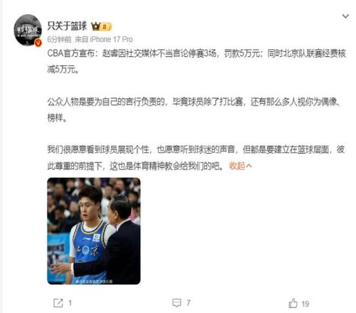 北京时间2月11日晚,CBA公司官方宣布对北京男篮球员赵睿进行处罚,赵睿因为在社交媒体发布严重不当言论被处以停赛三场、罚款5万元。