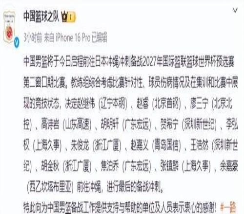中国男篮将于今日启程前往日本冲绳,全力备战世预赛第二窗口期的比赛。经过教练组的综合考虑,以及球员伤病情况和比赛中展现出的竞技状态,中国男篮最终决定派出14名球员征战本届世预赛,具体大名单如下:赵继伟(辽宁本钢)、赵睿(北京首钢)、廖三宁(北京北控)、高诗岩(山东高速)、胡明轩(广东宏远)、贺希宁(深圳新世纪)、李弘权(上海久事)、朱俊龙(浙江广厦)、赵嘉义(青岛国信)、王浩然(深圳新世纪)、胡金秋(浙江广厦)、焦泊乔(广东宏远)、张镇麟(上海久事)、余嘉豪(西乙坎塔布里亚)。由于一场比赛只能上报12名球员,郭士强带了14名球员就是为了防止伤病的发生,在对阵日本男篮赛前,中国男篮将会官宣最终12人大名单。
