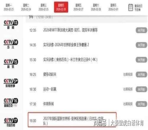 根据赛程显示,世预赛中国男篮vs日本队男篮的比赛将会在北京时间2月26日18点05分开打。