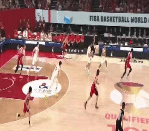 中国队随即打出精彩的配合:赵睿抢断后回抛,贺希宁得球直冲篮下,拿分!