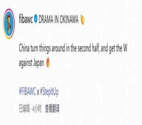 该内容被FIBA官方发布在Instagram和X双平台上,截至目前,FIBA官方中Instagram上修改了文案,修改后的文案为:冲绳上演精彩好戏,中国队下半场完成逆转,击败日本队拿下胜利。而X平台仍未修改文案。