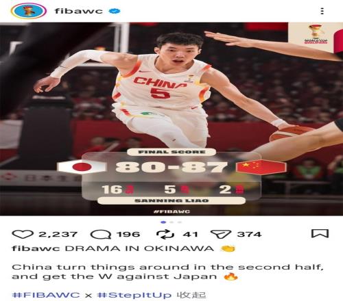 赛后,FIBA(国际篮球联合会)世界杯社交媒体官方账号写道:“冲绳神剧本!中国男篮从日本偷走一场胜利。”(China with a sneaky win over Japan),“Sneaky”一词隐含“鬼祟、卑鄙”的贬义,被质疑暗指中国队胜之不武,引发全球球迷强烈不满。
