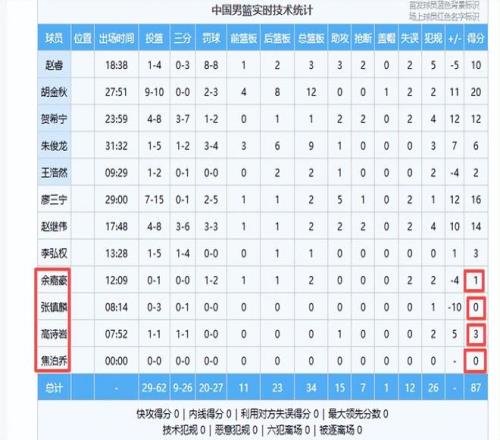 张镇麟已没有灵性和杀气,昨晚有空位不敢投,还投出三不沾,下半场遭到郭士强弃用,完全不像是一个老国手,就像是一个新兵,3投0中,是中国队上场的11名队员中唯一不得分的队员,8分钟内没篮板,没助攻,没抢断,没盖帽,可样的内线不要也罢。焦泊乔进入14人名单时就遭到质疑,果然一分钟也不打。高诗岩如果不是其他后卫犯规太多,可能他是基本不打,全场就中了一个三分。
