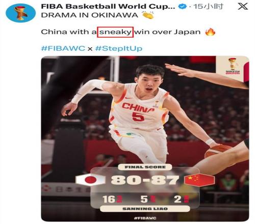更令人愤慨的是,比赛结束后,FIBA世界杯社交媒体官方账号在点评这场胜利时,竟使用了“中国男篮从日本偷走一场胜利”的表述,其英文原文中的“sneaky”一词隐含“鬼祟、卑鄙”的贬义,明显暗指中国男篮胜之不武,这一不当评价瞬间引发全球球迷的口诛笔伐。中国男篮在客场近乎“5打8”的艰难处境下,凭借球员的顽强拼搏实现大逆转,这样的胜利是汗水与毅力的结晶,绝非“偷”所能形容。反观日本队,全程依靠裁判的偏颇判罚寻求机会,即便如此仍未能取胜,真正试图“偷取”胜利的恰恰是日本队。