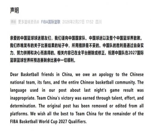 亲爱的中国篮球球迷朋友们,我们谨向中国国家队、中国球迷以及整个中国篮球界致歉。我们昨晚发布的关于比赛结果的帖子中,所用措辞是不妥的。中国队的胜利是通过自身实力、努力拼搏和决心而赢得的。相关内容已在全平台删除或修正。祝愿中国队在2027国际篮联篮球世界杯预选赛剩余比赛中一切顺利。
